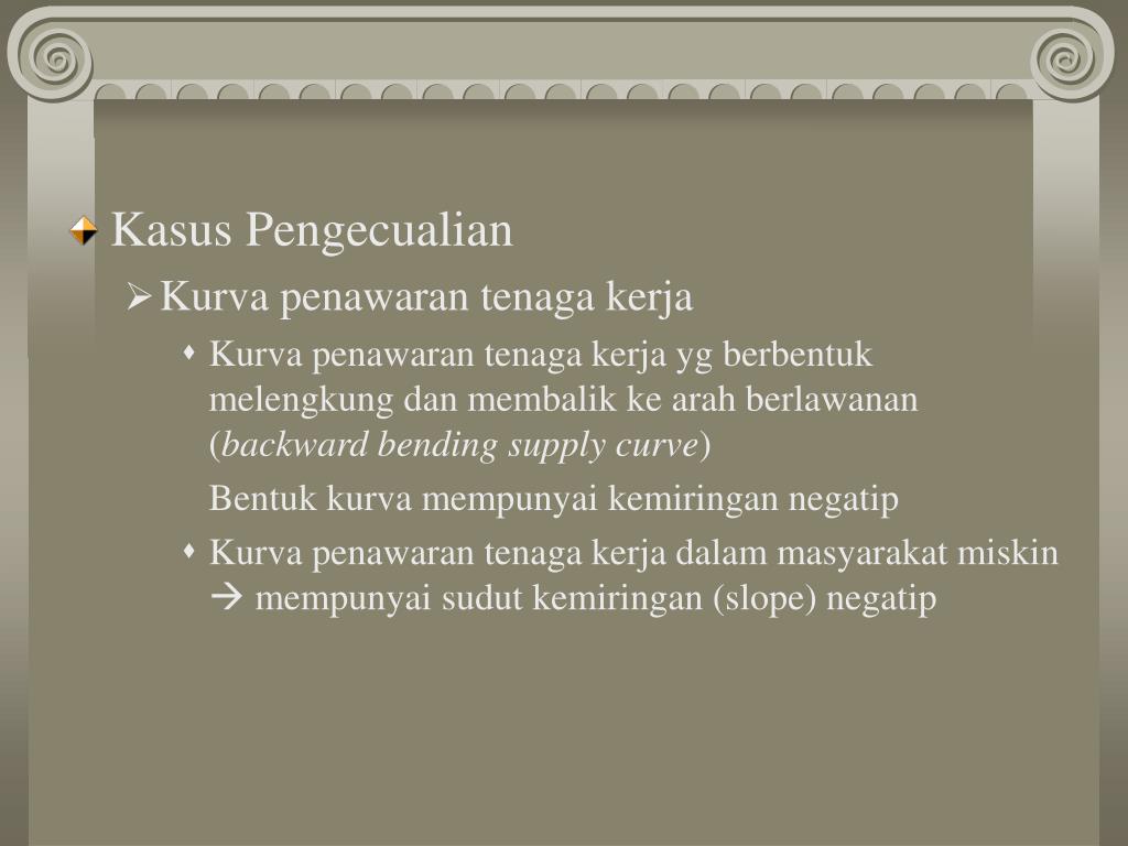 Kasus Pengecualian • Kurva penawaran tenaga kerja • Kurva penawaran tenaga kerja yg berbentuk melengkung dan membalik ke arah berlawanan (backward bending supply curve) Bentuk kurva mempunyai kemiringan negatip • Kurva penawaran tenaga kerja dalam masyarakat miskin mempunyai sudut kemiringan (slope) negatip