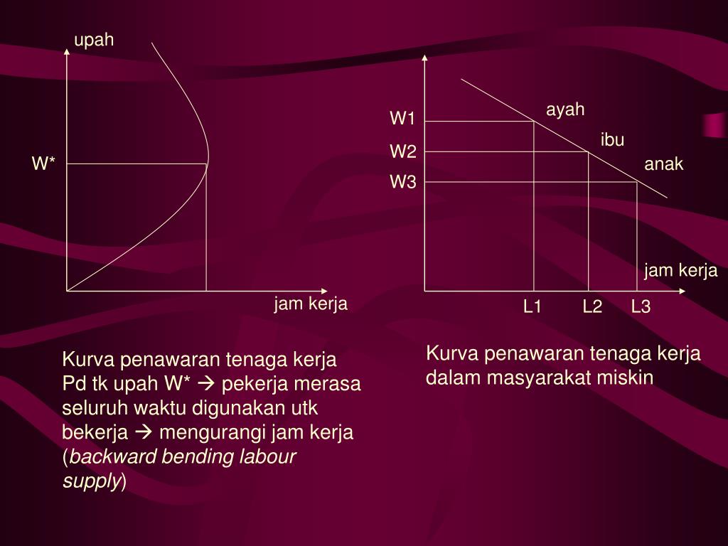 upah ayah W1 ibu W2 W* anak W3 jam kerja jam kerja L1 L2 L3 Kurva penawaran tenaga kerja dalam masyarakat miskin Kurva penawaran tenaga kerja Pd tk upah W* pekerja merasa seluruh waktu digunakan utk bekerja mengurangi jam kerja (backward bending labour supply)