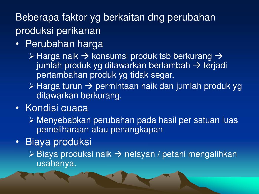 Beberapa faktor yg berkaitan dng perubahan produksi perikanan • Perubahan harga • Harga naik konsumsi produk tsb berkurang jumlah produk yg ditawarkan bertambah terjadi pertambahan produk yg tidak segar. • Harga turun permintaan naik dan jumlah produk yg ditawarkan berkurang. • Kondisi cuaca • Menyebabkan perubahan pada hasil per satuan luas pemeliharaan atau penangkapan • Biaya produksi • Biaya produksi naik nelayan / petani mengalihkan usahanya.