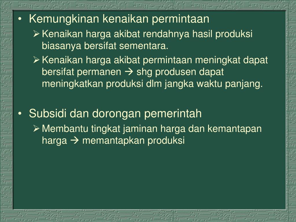 Kemungkinan kenaikan permintaan • Kenaikan harga akibat rendahnya hasil produksi biasanya bersifat sementara. • Kenaikan harga akibat permintaan meningkat dapat bersifat permanen shg produsen dapat meningkatkan produksi dlm jangka waktu panjang. • Subsidi dan dorongan pemerintah • Membantu tingkat jaminan harga dan kemantapan harga memantapkan produksi