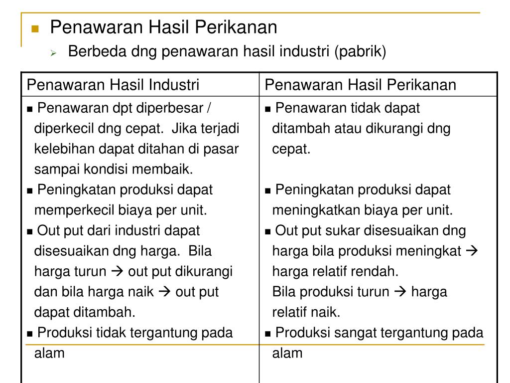 Penawaran Hasil Perikanan • Berbeda dng penawaran hasil industri (pabrik)