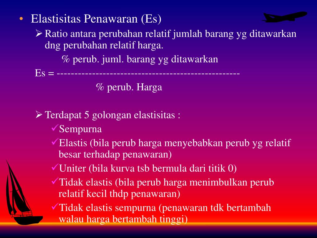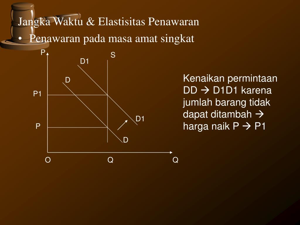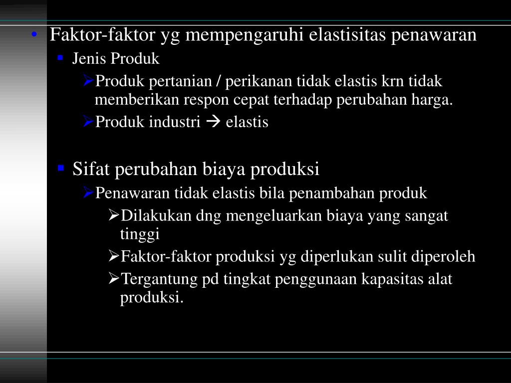 Penawaran elastis bila penawaran dapat ditambah dng biaya tambahan tdk terlalu besar. • Jangka waktu • Masa singkat penawaran bersifat tidak elastis sempurna krn sulit menambah dlm jangka waktu amat singkat. • Jangka pendek penawaran bersifat tidak elastis krn sulit menambah kapasitas alat-alat produksi dlm jangka pendek pertambahan produksi tidak terlalu besar. • Jangka panjang penawaran bersifat elastis. Produksi dan jumlah barang mudah ditambah kenaikan harga < drpd kenaikan harga jangka panjang.