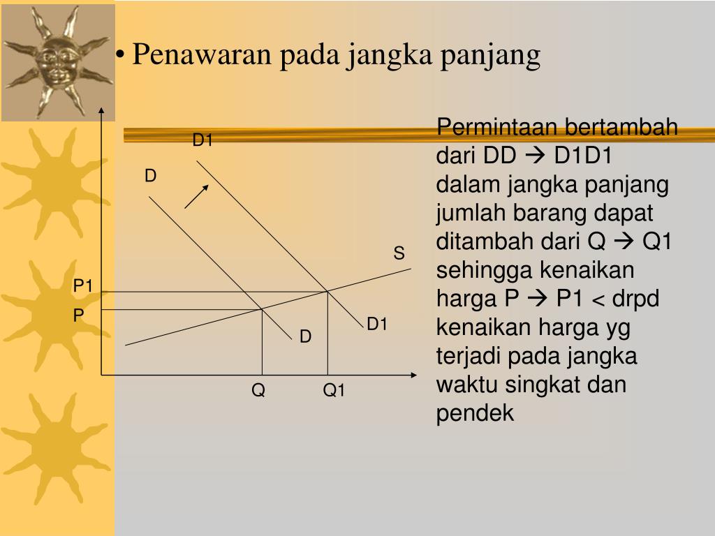 D1 S Penggunaanfaktor-faktor produksi lebih intensif menambah prod. barang Q Q1 shg kenaikan permintaan DD D1D1 tidak menaikkan harga sebesar kenaikan harga seperti yang terjadi pada masa singkat krn penawarannya yg bersifat tidak elastis • Penawaran pada jangka pendek D P1 D1 P D Q Q1