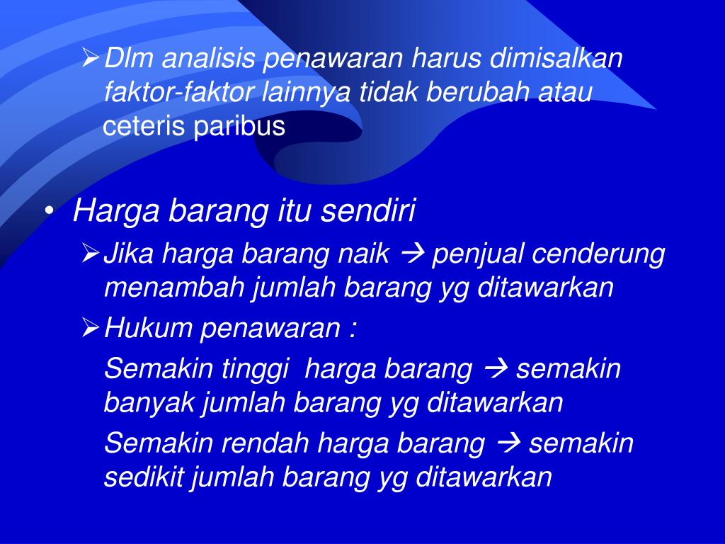 Dlm analisis penawaran harus dimisalkan faktor-faktor lainnya tidak berubah atau ceteris paribus • Harga barang itu sendiri • Jika harga barang naik penjual cenderung menambah jumlah barang yg ditawarkan • Hukum penawaran : Semakin tinggi harga barang semakin banyak jumlah barang yg ditawarkan Semakin rendah harga barang semakin sedikit jumlah barang yg ditawarkan