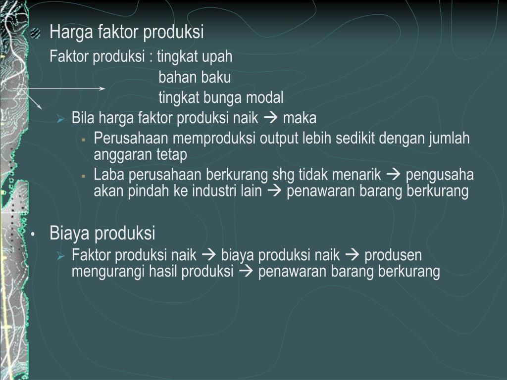 Harga faktor produksi Faktor produksi : tingkat upah bahan baku tingkat bunga modal • Bila harga faktor produksi naik maka • Perusahaan memproduksi output lebih sedikit dengan jumlah anggaran tetap • Laba perusahaan berkurang shg tidak menarik pengusaha akan pindah ke industri lain penawaran barang berkurang • Biaya produksi • Faktor produksi naik biaya produksi naik produsen mengurangi hasil produksi penawaran barang berkurang