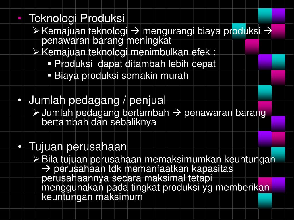 Teknologi Produksi • Kemajuan teknologi mengurangi biaya produksi penawaran barang meningkat • Kemajuan teknologi menimbulkan efek : • Produksi dapat ditambah lebih cepat • Biaya produksi semakin murah • Jumlah pedagang / penjual • Jumlah pedagang bertambah penawaran barang bertambah dan sebaliknya • Tujuan perusahaan • Bila tujuan perusahaan memaksimumkan keuntungan perusahaan tdk memanfaatkan kapasitas perusahaannya secara maksimal tetapi menggunakan pada tingkat produksi yg memberikan keuntungan maksimum