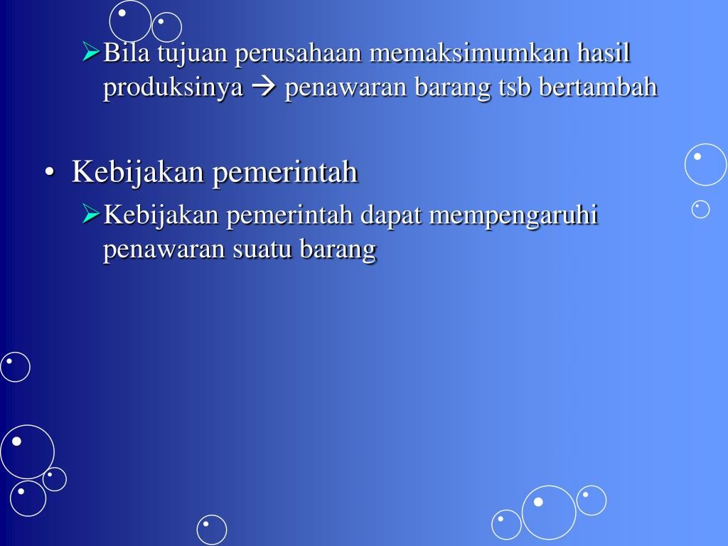 Bila tujuan perusahaan memaksimumkan hasil produksinya penawaran barang tsb bertambah • Kebijakan pemerintah • Kebijakan pemerintah dapat mempengaruhi penawaran suatu barang