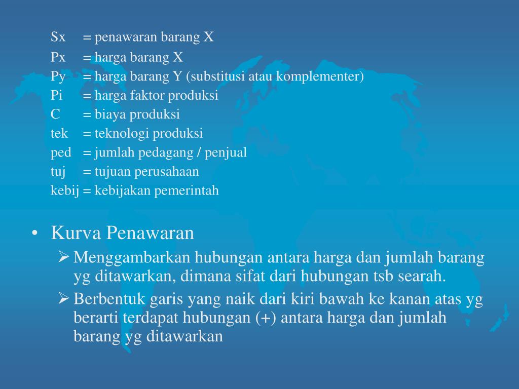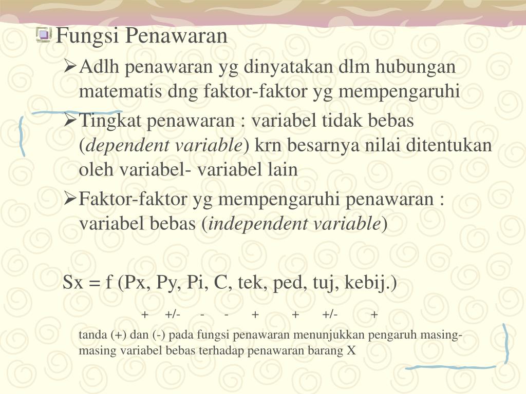 Fungsi Penawaran • Adlh penawaran yg dinyatakan dlm hubungan matematis dng faktor-faktor yg mempengaruhi • Tingkat penawaran : variabel tidak bebas (dependent variable) krn besarnya nilai ditentukan oleh variabel- variabel lain • Faktor-faktor yg mempengaruhi penawaran : variabel bebas (independent variable) Sx = f (Px, Py, Pi, C, tek, ped, tuj, kebij.) + +/- - - + + +/- + tanda (+) dan (-) pada fungsi penawaran menunjukkan pengaruh masing-masing variabel bebas terhadap penawaran barang X