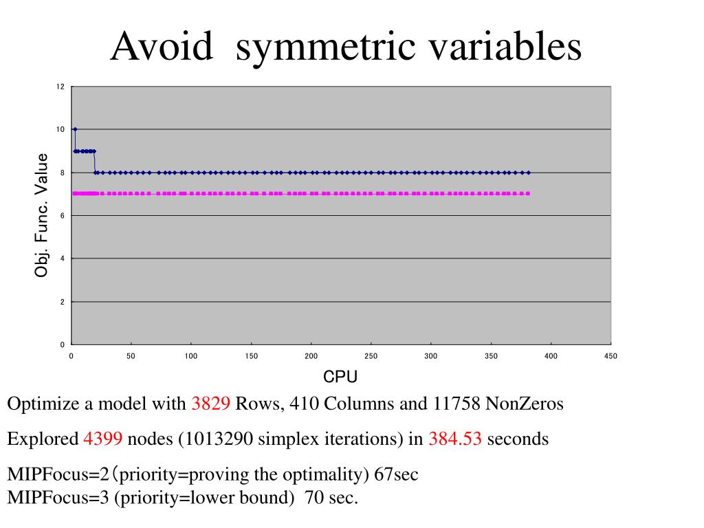 Avoid symmetric variables Optimize a model with 3829 Rows, 410 Columns and 11758 NonZeros Explored 4399 nodes (1013290 simplex iterations) in 384.53 seconds MIPFocus=2(priority=proving the optimality) 67secMIPFocus=3 (priority=lower bound) 70 sec.