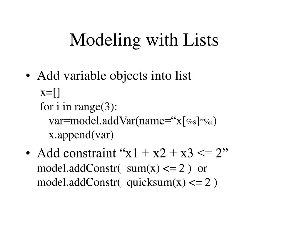 Modeling with Lists • Add variable objects into listx=[] for i in range(3): var=model.addVar(name=“x[%s]”%i) x.append(var) • Add constraint “x1 + x2 + x3 <= 2”model.addConstr( sum(x) <= 2 ) or model.addConstr( quicksum(x) <= 2 )