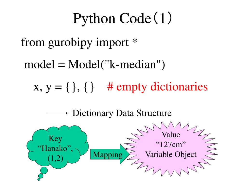 Python Code(1) from gurobipy import * model = Model("k-median") x, y = {}, {} # empty dictionaries Dictionary Data Structure Value “127cm” Variable Object Key “Hanako”, (1,2) Mapping