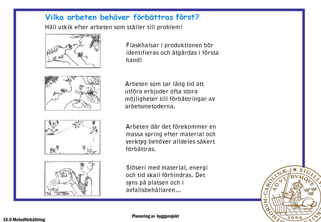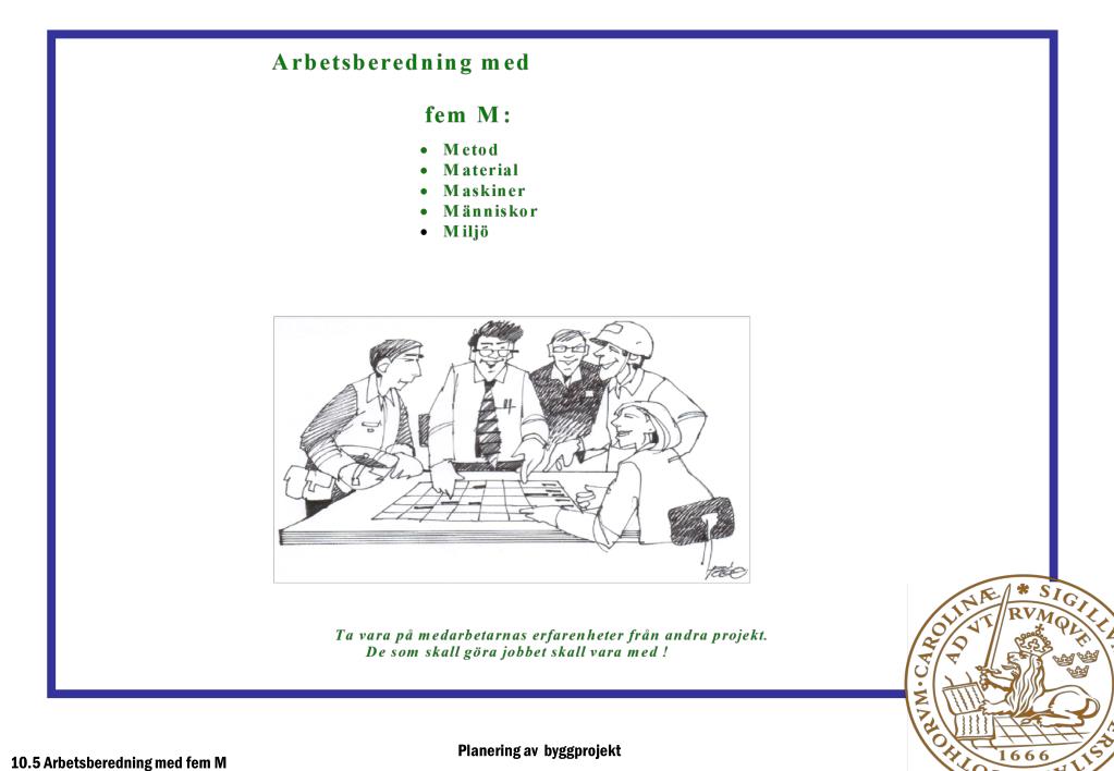 MiljöEn ren och prydlig arbetsplats är ofta också en säker och bra arbetsplats. Planera hur källsortering och renhållning skall ske. Hur skall avfallet transporteras från arbetsställena till uppsamlingsbehållarna? PersonallokalerPersonalbodar och kontor bör placeras för minimala gångavstånd. Gemensam matsal för alla medför trivsel och möjlighet till effektiva information och möten.Kontor placeras med uppsikt över arbetsplatsens infart. FörvaringFörsök att få materialen levererade så nära inbyggnadsställena som möjligt. Omflyttningar medför skador och svinn VerkstäderLokaler för bearbetning kan krävas för egna arbeten eller entreprenörernas. LeveranserTransporter av material till och från arbetsplatsen måste fungera smidigt. Sträva efter rundkörning på arbetsområdet. KranarNär kranar används ritas de in med sina räckvidder. Skriv in spetslasten dvs. hur mycket kranen lyfter vid full utliggning. StällningarVilken typ av ställning skall användas - Fast ställning, tornställningar, hängställning, klätterställning eller arbetsplattformar? Krävs återfyllning? Försörjning El - VA Upprätta en total elplanering för området. På så sätt undviks onödiga flyttningar av centraler, sönderkörda kablar, tillfälliga kabeldragningar som vållar oreda, irritation och olyckor.. Etablering av arbetsplats – tänk på attEn effektiv och prydlig etablering är företagets ansikte utåt! 9.2 Placeringsritning – tänk på!