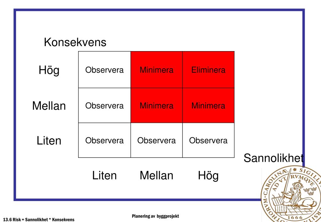 Riskplanering Risk i bygg- och anläggningsprojekt Analys av risker, deras konsekvenser och handlingsplan Planera för att undvika risker Riskanalys för arbetsskada Riskanalys för arbetsskada Risk = Sannolikhet * Konsekvens