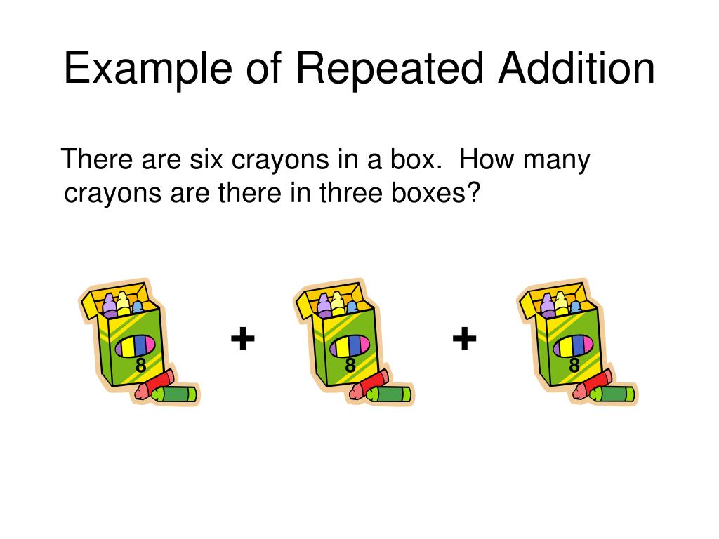 + + 8 8 8 Example of Repeated Addition There are six crayons in a box. How many crayons are there in three boxes?