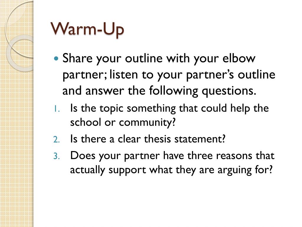 Warm-Up • Share your outline with your elbow partner; listen to your partner’s outline and answer the following questions. • Is the topic something that could help the school or community? • Is there a clear thesis statement? • Does your partner have three reasons that actually support what they are arguing for?