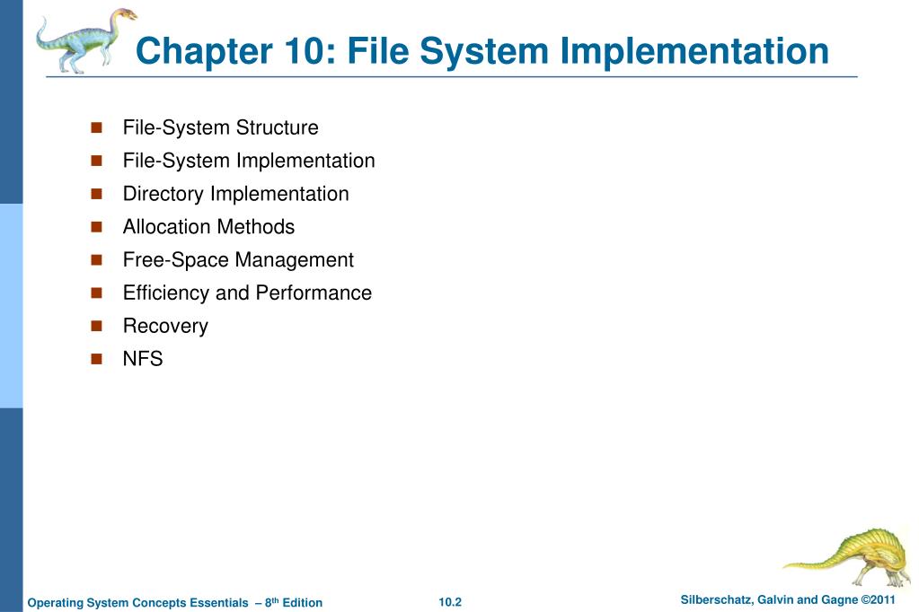 Chapter 10: File System Implementation • File-System Structure • File-System Implementation • Directory Implementation • Allocation Methods • Free-Space Management • Efficiency and Performance • Recovery • NFS