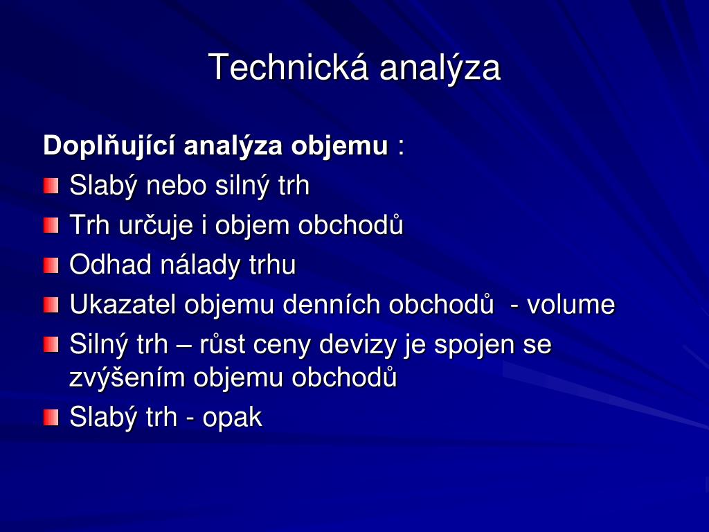 Technická analýza Doplňující analýza objemu : Slabý nebo silný trh Trh určuje i objem obchodů Odhad nálady trhu Ukazatel objemu denních obchodů - volume Silný trh – růst ceny devizy je spojen se zvýšením objemu obchodů Slabý trh - opak