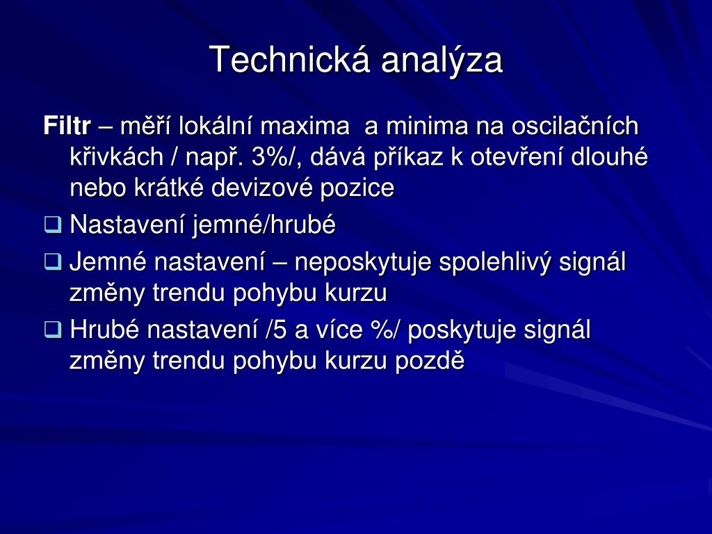 Technická analýza Filtr – měří lokální maxima a minima na oscilačních křivkách / např. 3%/, dává příkaz k otevření dlouhé nebo krátké devizové pozice • Nastavení jemné/hrubé • Jemné nastavení – neposkytuje spolehlivý signál změny trendu pohybu kurzu • Hrubé nastavení /5 a více %/ poskytuje signál změny trendu pohybu kurzu pozdě