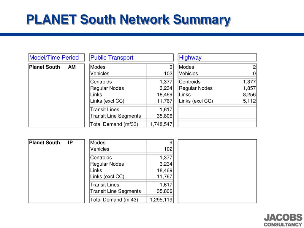 PLANET – A comprehensive tool for forecast and appraisal of public transport schemes in the UK. 12th European EMME/2 Users’ Conference Basel, Switzerland (22-23 May 2003). Peter Bartlett (Jacobs Consultancy). Presentation Summary. History of PLANET Interfaces Development of PS2002 models
