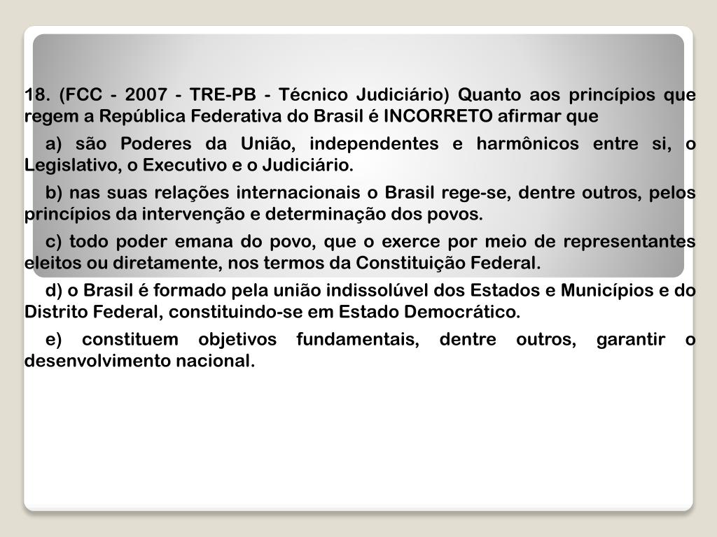 18. (FCC - 2007 - TRE-PB - Técnico Judiciário) Quanto aos princípios que regem a República Federativa do Brasil é INCORRETO afirmar que a) são Poderes da União, independentes e harmônicos entre si, o Legislativo, o Executivo e o Judiciário. b) nas suas relações internacionais o Brasil rege-se, dentre outros, pelos princípios da intervenção e determinação dos povos. c) todo poder emana do povo, que o exerce por meio de representantes eleitos ou diretamente, nos termos da Constituição Federal. d) o Brasil é formado pela união indissolúvel dos Estados e Municípios e do Distrito Federal, constituindo-se em Estado Democrático. e) constituem objetivos fundamentais, dentre outros, garantir o desenvolvimento nacional.