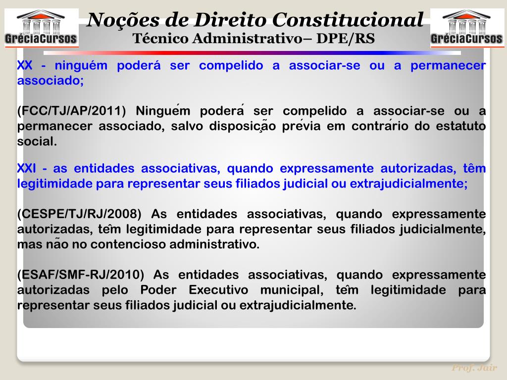 XX - ninguém poderá ser compelido a associar-se ou a permanecer associado; (FCC/TJ/AP/2011) Ninguém poderá ser compelido a associar-se ou a permanecer associado, salvo disposição prévia em contrário do estatuto social. XXI - as entidades associativas, quando expressamente autorizadas, têm legitimidade para representar seus filiados judicial ou extrajudicialmente; (CESPE/TJ/RJ/2008) As entidades associativas, quando expressamente autorizadas, têm legitimidade para representar seus filiados judicialmente, mas não no contencioso administrativo. (ESAF/SMF-RJ/2010) As entidades associativas, quando expressamente autorizadas pelo Poder Executivo municipal, têm legitimidade para representar seus filiados judicial ou extrajudicialmente.