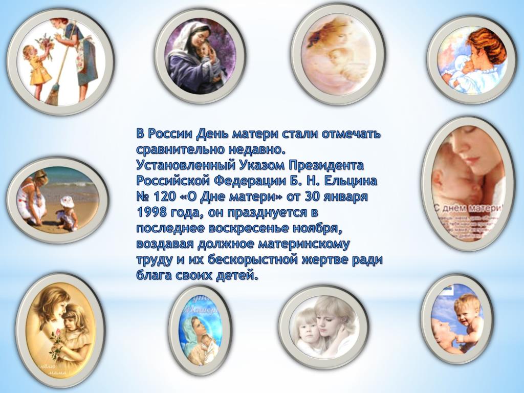 4. В России День матери стали отмечать сравнительно недавно. Установленный Указом Президента Российской Федерации Б. Н. Ельцина № 120 «О Дне матери» от 30 января 1998 года, он празднуется в последнее воскресенье ноября, воздавая должное материнскому труду и их бескорыстной жертве ради блага своих детей.