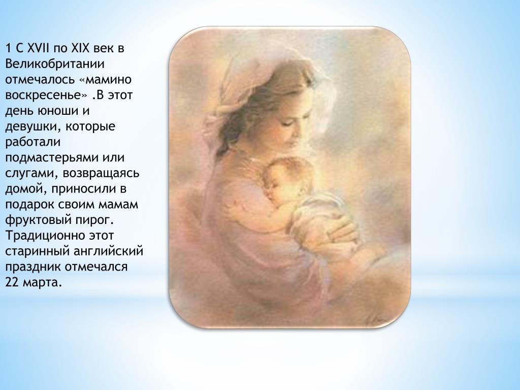 5. 1 С XVII по XIX век в Великобритании отмечалось «мамино воскресенье» .В этот день юноши и девушки, которые работали подмастерьями или слугами, возвращаясь домой, приносили в подарок своим мамам фруктовый пирог. Традиционно этот старинный английский праздник отмечался 22 марта.
