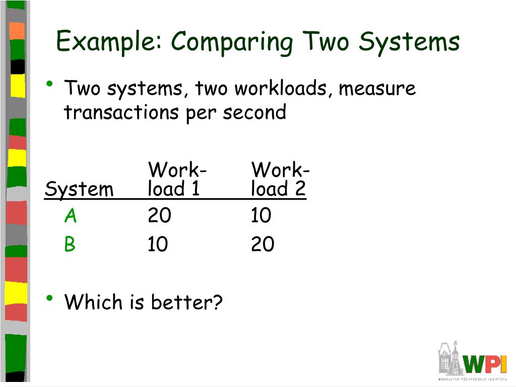 Example: Comparing Two Systems • Two systems, two workloads, measure transactions per second Work- Work- System load 1 load 2 A 20 10 B 10 20 • Which is better?