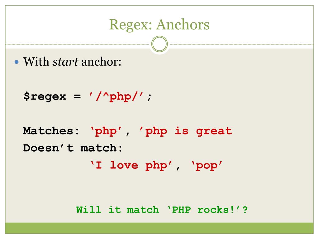 Regex: Anchors • With NO anchors: $regex = ’/php/’; Matches: ‘php’, ’php is great’, ‘I love php’ Doesn’t match: ‘pop’