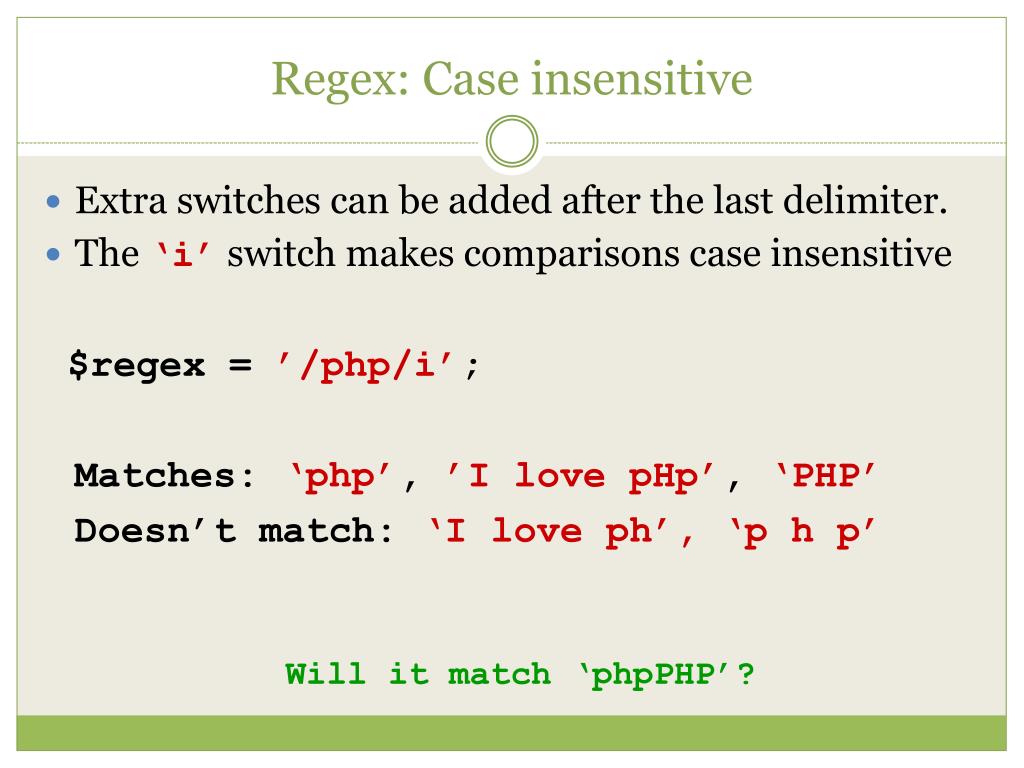 Regex: Case insensitive • Extra switches can be added after the last delimiter. • The ‘i’ switch makes comparisons case insensitive $regex = ’/php/i’; Matches: ‘php’, ’I love pHp’, ‘PHP’ Doesn’t match: ‘I love ph’, ‘p h p’ Will it match ‘phpPHP’?