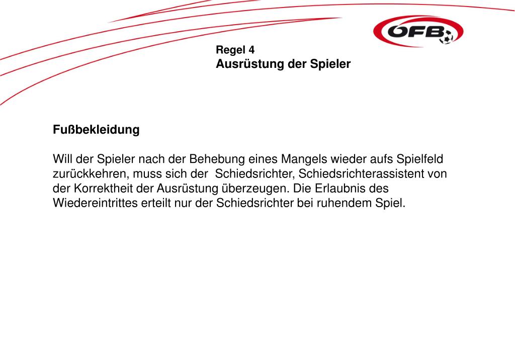 Regel 4 Ausrüstung der Spieler Fußbekleidung Will der Spieler nach der Behebung eines Mangels wieder aufs Spielfeld zurückkehren, muss sich der Schiedsrichter, Schiedsrichterassistent von der Korrektheit der Ausrüstung überzeugen. Die Erlaubnis des Wiedereintrittes erteilt nur der Schiedsrichter bei ruhendem Spiel.