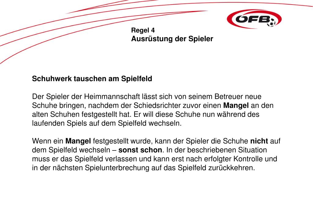 Regel 4 Ausrüstung der Spieler Schuhwerk tauschen am Spielfeld Der Spieler der Heimmannschaft lässt sich von seinem Betreuer neue Schuhe bringen, nachdem der Schiedsrichter zuvor einen Mangel an den alten Schuhen festgestellt hat. Er will diese Schuhe nun während des laufenden Spiels auf dem Spielfeld wechseln. Wenn ein Mangel festgestellt wurde, kann der Spieler die Schuhe nicht auf dem Spielfeld wechseln – sonst schon. In der beschriebenen Situation muss er das Spielfeld verlassen und kann erst nach erfolgter Kontrolle und in der nächsten Spielunterbrechung auf das Spielfeld zurückkehren.