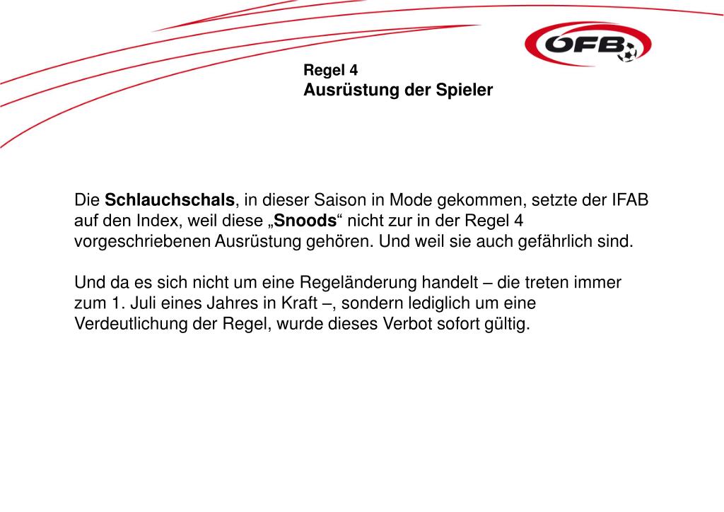 Regel 4 Ausrüstung der Spieler Die Schlauchschals, in dieser Saison in Mode gekommen, setzte der IFAB auf den Index, weil diese „Snoods“ nicht zur in der Regel 4 vorgeschriebenen Ausrüstung gehören. Und weil sie auch gefährlich sind. Und da es sich nicht um eine Regeländerung handelt – die treten immer zum 1. Juli eines Jahres in Kraft –, sondern lediglich um eine Verdeutlichung der Regel, wurde dieses Verbot sofort gültig.