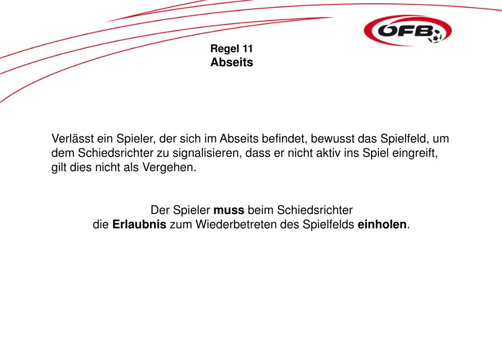 Regel 11 Abseits Verlässt ein Spieler, der sich im Abseits befindet, bewusst das Spielfeld, um dem Schiedsrichter zu signalisieren, dass er nicht aktiv ins Spiel eingreift, gilt dies nicht als Vergehen. Der Spieler muss beim Schiedsrichter die Erlaubnis zum Wiederbetreten des Spielfelds einholen.