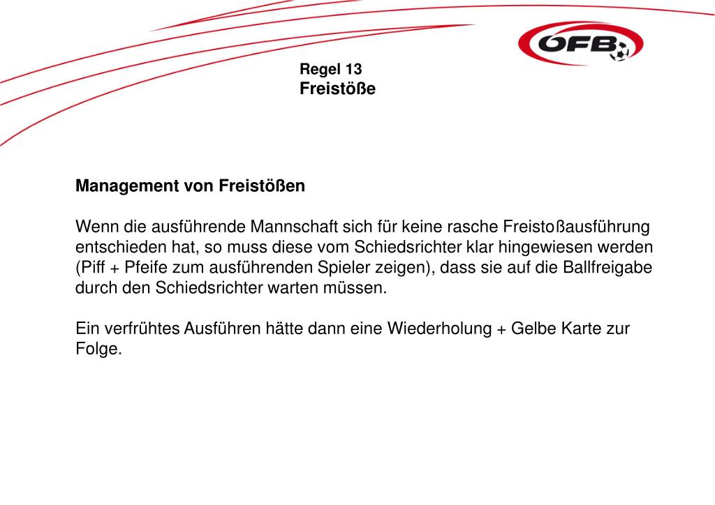 Regel 13 Freistöße Management von Freistößen Wenn die ausführende Mannschaft sich für keine rasche Freistoßausführung entschieden hat, so muss diese vom Schiedsrichter klar hingewiesen werden (Piff + Pfeife zum ausführenden Spieler zeigen), dass sie auf die Ballfreigabe durch den Schiedsrichter warten müssen. Ein verfrühtes Ausführen hätte dann eine Wiederholung + Gelbe Karte zur Folge.