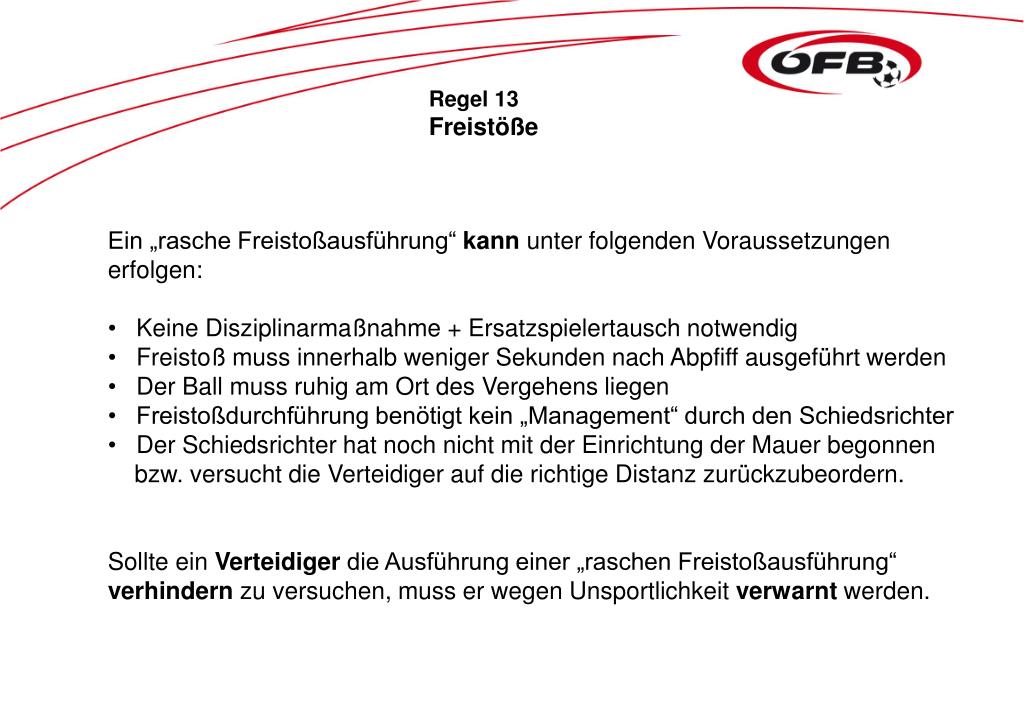 Regel 13 Freistöße • Ein „rasche Freistoßausführung“ kann unter folgenden Voraussetzungen erfolgen: • Keine Disziplinarmaßnahme + Ersatzspielertausch notwendig • Freistoß muss innerhalb weniger Sekunden nach Abpfiff ausgeführt werden • Der Ball muss ruhig am Ort des Vergehens liegen • Freistoßdurchführung benötigt kein „Management“ durch den Schiedsrichter • Der Schiedsrichter hat noch nicht mit der Einrichtung der Mauer begonnen • bzw. versucht die Verteidiger auf die richtige Distanz zurückzubeordern. • Sollte ein Verteidiger die Ausführung einer „raschen Freistoßausführung“ verhindern zu versuchen, muss er wegen Unsportlichkeit verwarnt werden.