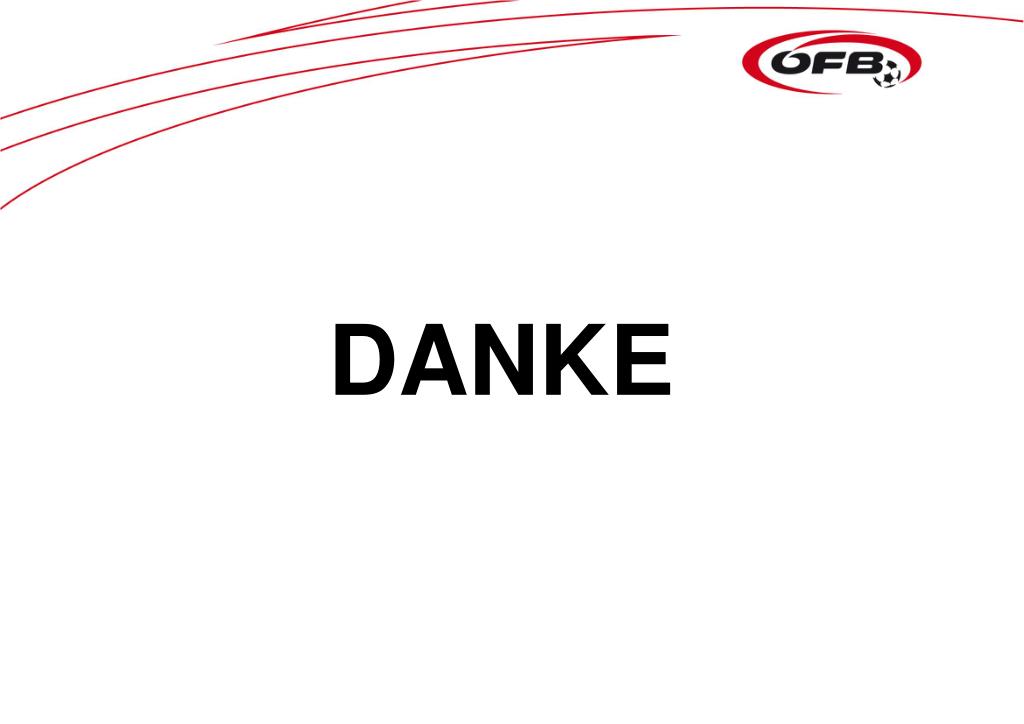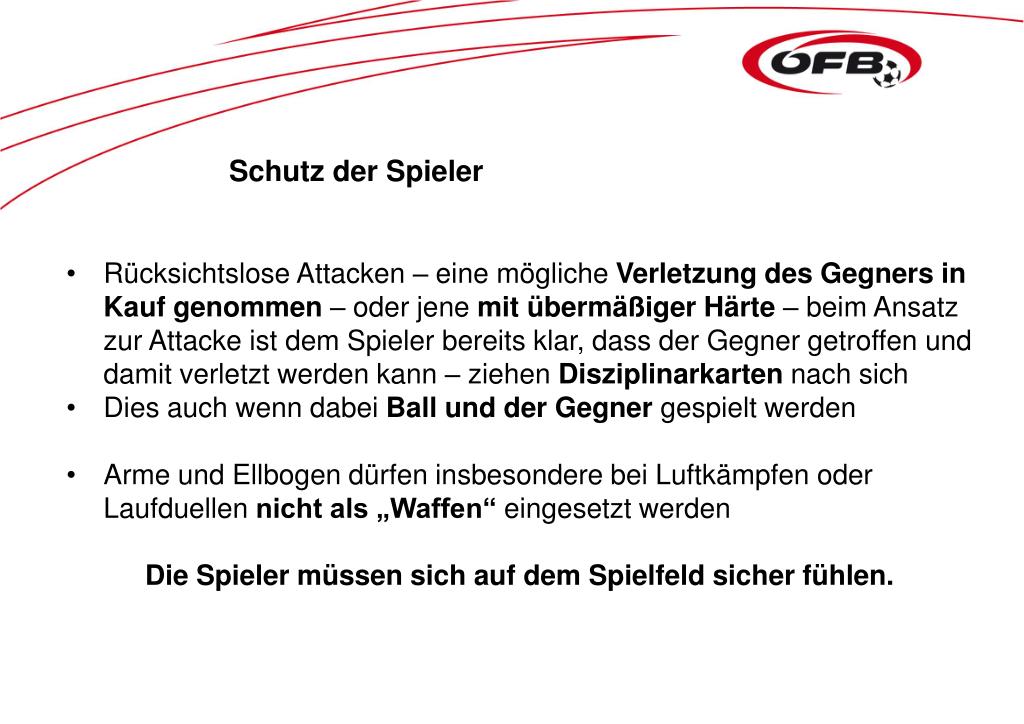 Schutz der Spieler • Rücksichtslose Attacken – eine mögliche Verletzung des Gegners in Kauf genommen – oder jene mit übermäßiger Härte – beim Ansatz zur Attacke ist dem Spieler bereits klar, dass der Gegner getroffen und damit verletzt werden kann – ziehen Disziplinarkarten nach sich • Dies auch wenn dabei Ball und der Gegner gespielt werden • Arme und Ellbogen dürfen insbesondere bei Luftkämpfen oder Laufduellen nicht als „Waffen“ eingesetzt werden • Die Spieler müssen sich auf dem Spielfeld sicher fühlen.