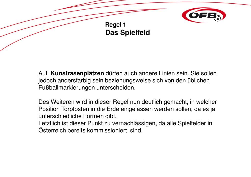 Regel 1 Das Spielfeld Auf Kunstrasenplätzen dürfen auch andere Linien sein. Sie sollen jedoch andersfarbig sein beziehungsweise sich von den üblichen Fußballmarkierungen unterscheiden. Des Weiteren wird in dieser Regel nun deutlich gemacht, in welcher Position Torpfosten in die Erde eingelassen werden sollen, da es ja unterschiedliche Formen gibt. Letztlich ist dieser Punkt zu vernachlässigen, da alle Spielfelder in Österreich bereits kommissioniert sind.