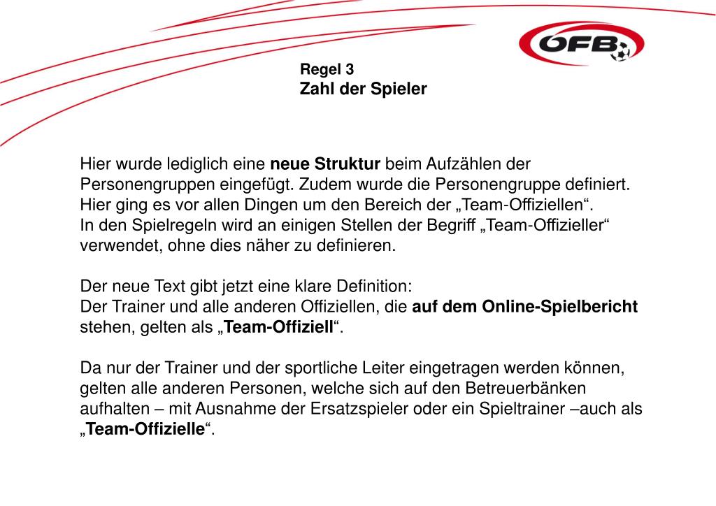 Regel 3 Zahl der Spieler Hier wurde lediglich eine neue Struktur beim Aufzählen der Personengruppen eingefügt. Zudem wurde die Personengruppe definiert. Hier ging es vor allen Dingen um den Bereich der „Team-Offiziellen“. In den Spielregeln wird an einigen Stellen der Begriff „Team-Offizieller“ verwendet, ohne dies näher zu definieren. Der neue Text gibt jetzt eine klare Definition: Der Trainer und alle anderen Offiziellen, die auf dem Online-Spielbericht stehen, gelten als „Team-Offiziell“. Da nur der Trainer und der sportliche Leiter eingetragen werden können, gelten alle anderen Personen, welche sich auf den Betreuerbänken aufhalten – mit Ausnahme der Ersatzspieler oder ein Spieltrainer –auch als „Team-Offizielle“.