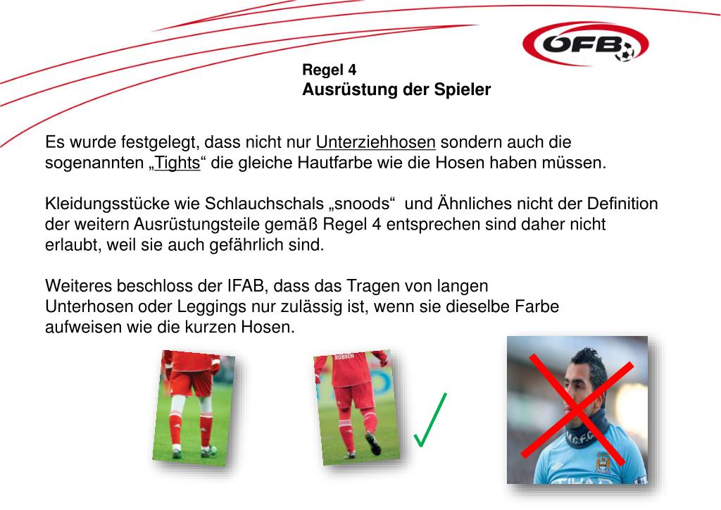 Regel 4 Ausrüstung der Spieler Es wurde festgelegt, dass nicht nur Unterziehhosen sondern auch die sogenannten „Tights“ die gleiche Hautfarbe wie die Hosen haben müssen. Kleidungsstücke wie Schlauchschals „snoods“ und Ähnliches nicht der Definition der weitern Ausrüstungsteile gemäß Regel 4 entsprechen sind daher nicht erlaubt, weil sie auch gefährlich sind. Weiteres beschloss der IFAB, dass das Tragen von langen Unterhosen oder Leggings nur zulässig ist, wenn sie dieselbe Farbe aufweisen wie die kurzen Hosen.