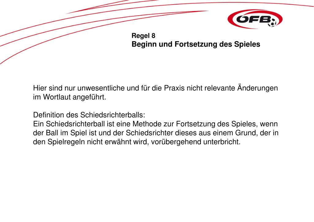 Regel 8 Beginn und Fortsetzung des Spieles Hier sind nur unwesentliche und für die Praxis nicht relevante Änderungen im Wortlaut angeführt. Definition des Schiedsrichterballs: Ein Schiedsrichterball ist eine Methode zur Fortsetzung des Spieles, wenn der Ball im Spiel ist und der Schiedsrichter dieses aus einem Grund, der in den Spielregeln nicht erwähnt wird, vorübergehend unterbricht.