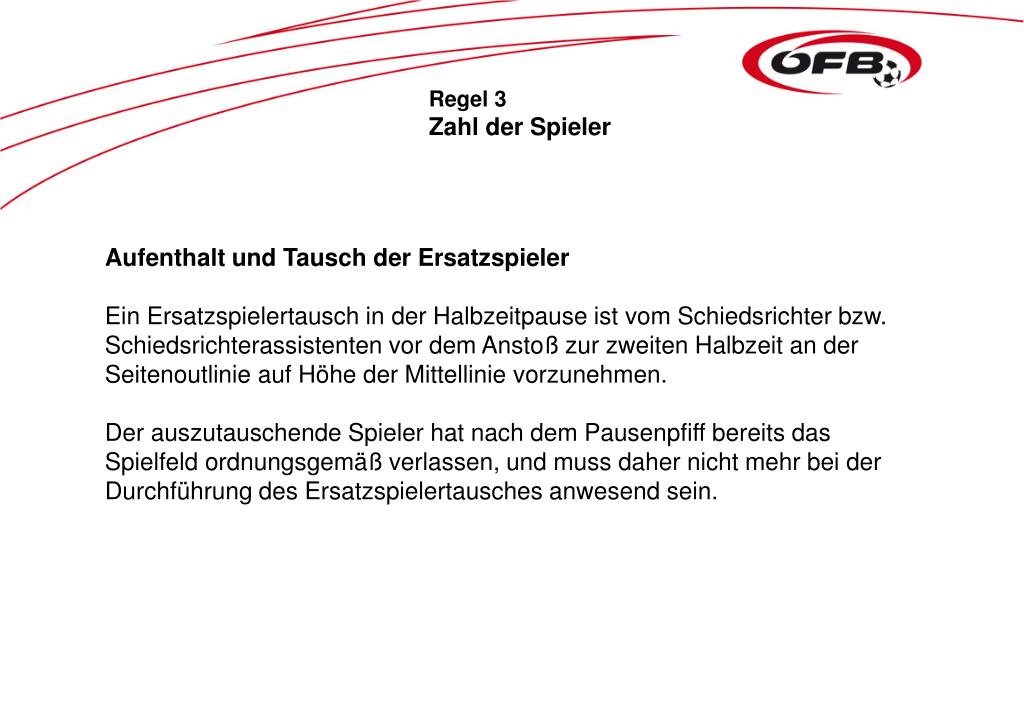 Regel 3 Zahl der Spieler Aufenthalt und Tausch der Ersatzspieler Ein Ersatzspielertausch in der Halbzeitpause ist vom Schiedsrichter bzw. Schiedsrichterassistenten vor dem Anstoß zur zweiten Halbzeit an der Seitenoutlinie auf Höhe der Mittellinie vorzunehmen. Der auszutauschende Spieler hat nach dem Pausenpfiff bereits das Spielfeld ordnungsgemäß verlassen, und muss daher nicht mehr bei der Durchführung des Ersatzspielertausches anwesend sein.