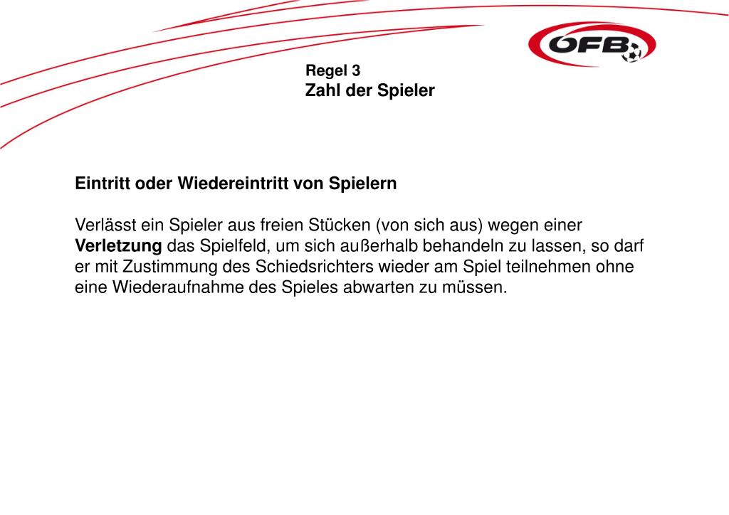 Regel 3 Zahl der Spieler Eintritt oder Wiedereintritt von Spielern Verlässt ein Spieler aus freien Stücken (von sich aus) wegen einer Verletzung das Spielfeld, um sich außerhalb behandeln zu lassen, so darf er mit Zustimmung des Schiedsrichters wieder am Spiel teilnehmen ohne eine Wiederaufnahme des Spieles abwarten zu müssen.