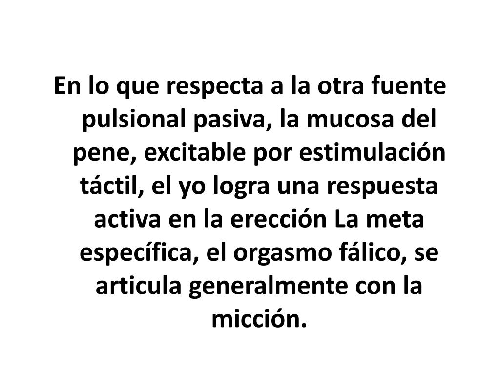 En lo que respecta a la otra fuente pulsional pasiva, la mucosa del pene, excitable por estimulación táctil, el yo logra una respuesta activa en la erección La meta específica, el orgasmo fálico, se articula generalmente con la micción.