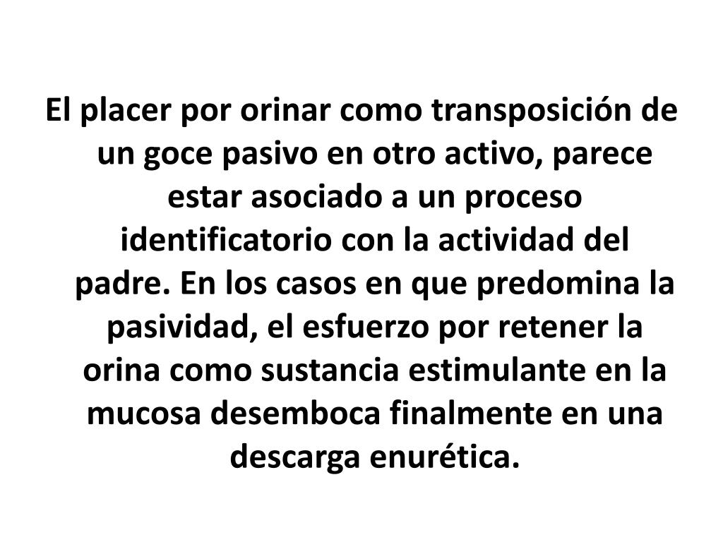 El placer por orinar como transposición de un goce pasivo en otro activo, parece estar asociado a un proceso identificatorio con la actividad del padre. En los casos en que predomina la pasividad, el esfuerzo por retener la orina como sustancia estimulante en la mucosa desemboca finalmente en una descarga enurética.