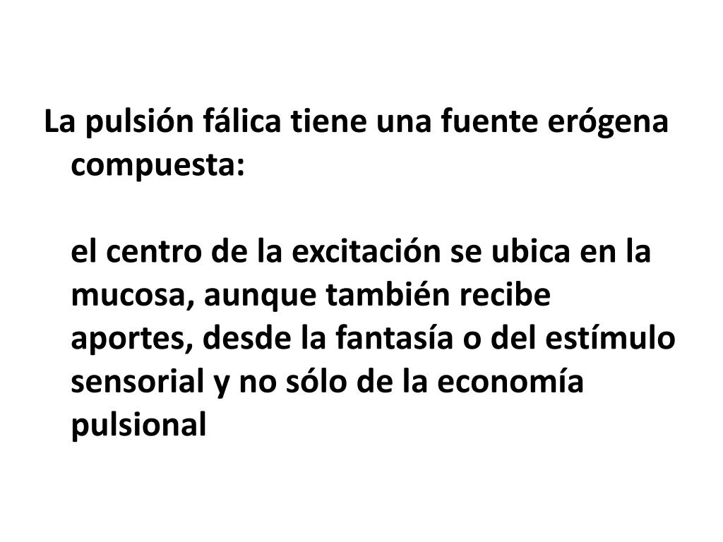 La pulsión fálica tiene una fuente erógena compuesta: el centro de la excitación se ubica en la mucosa, aunque también recibe aportes, desde la fantasía o del estímulo sensorial y no sólo de la economía pulsional