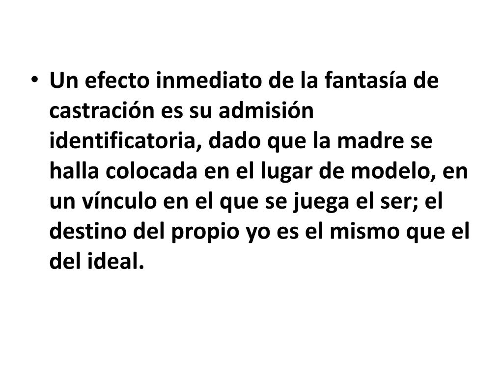 Un efecto inmediato de la fantasía de castración es su admisión identificatoria, dado que la madre se halla colocada en el lugar de modelo, en un vínculo en el que se juega el ser; el destino del propio yo es el mismo que el del ideal.