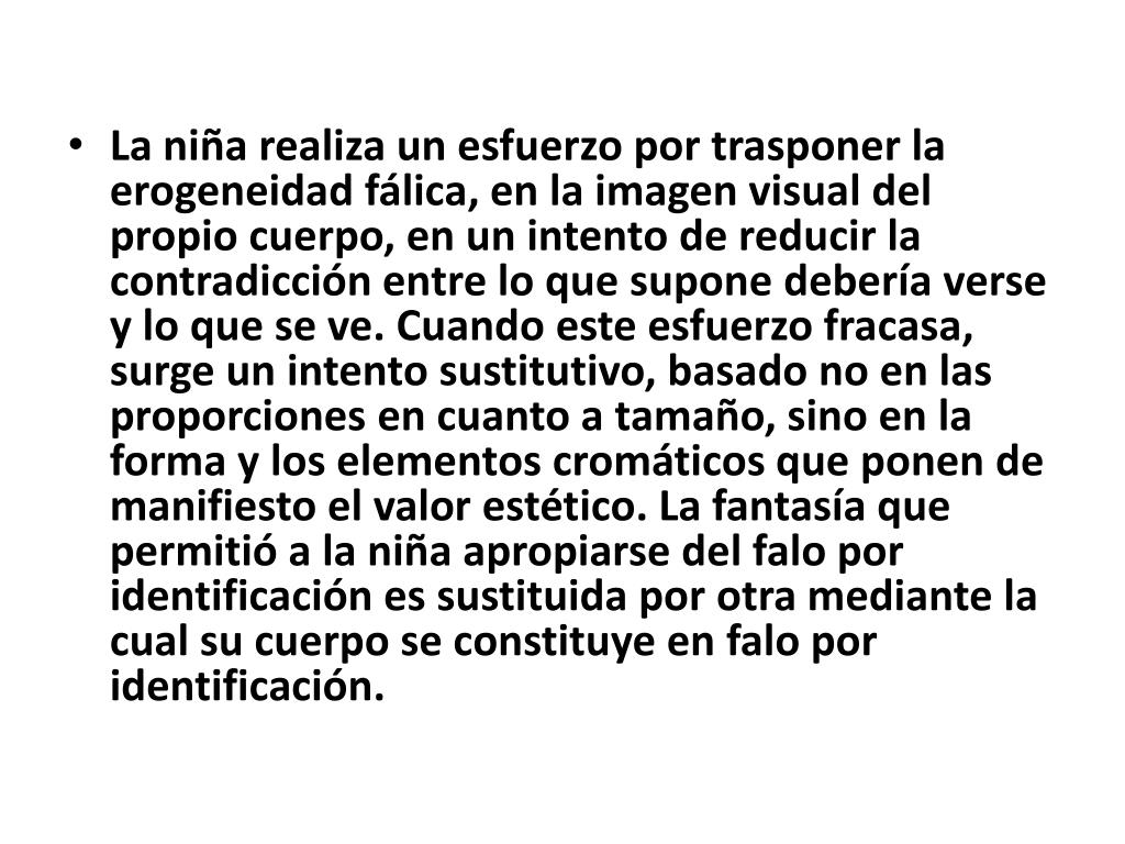 La niña realiza un esfuerzo por trasponer la erogeneidad fálica, en la imagen visual del propio cuerpo, en un intento de reducir la contradicción entre lo que supone debería verse y lo que se ve. Cuando este esfuerzo fracasa, surge un intento sustitutivo, basado no en las proporciones en cuanto a tamaño, sino en la forma y los elementos cromáticos que ponen de manifiesto el valor estético. La fantasía que permitió a la niña apropiarse del falo por identificación es sustituida por otra mediante la cual su cuerpo se constituye en falo por identificación.