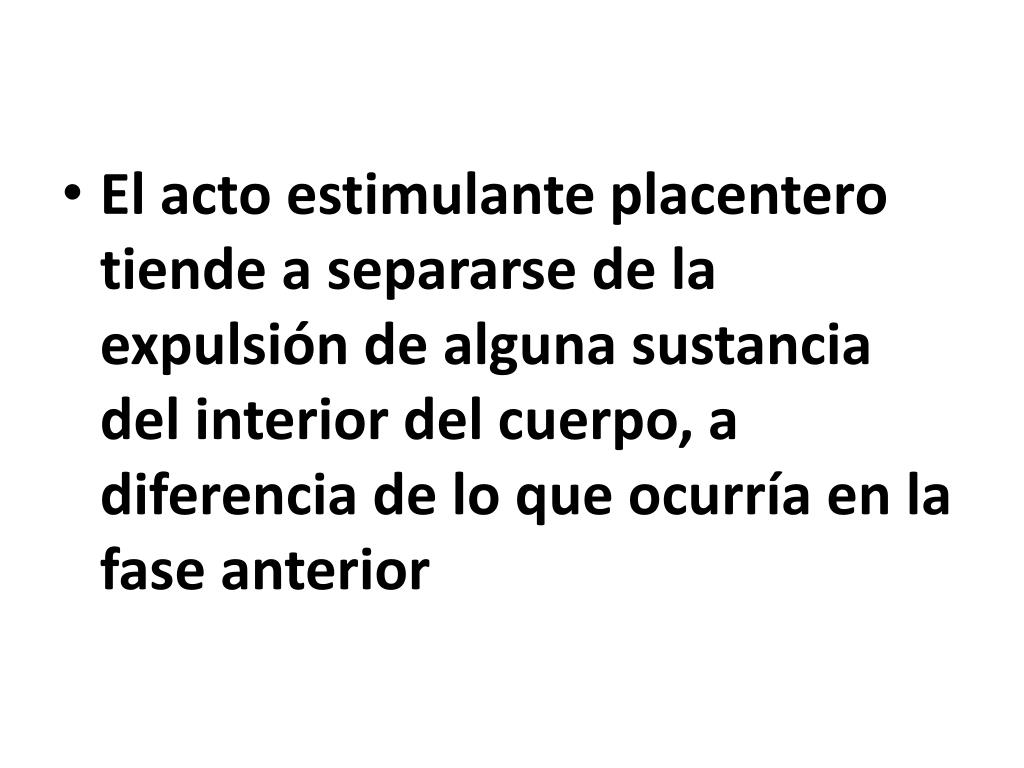 El acto estimulante placentero tiende a separarse de la expulsión de alguna sustancia del interior del cuerpo, a diferencia de lo que ocurría en la fase anterior