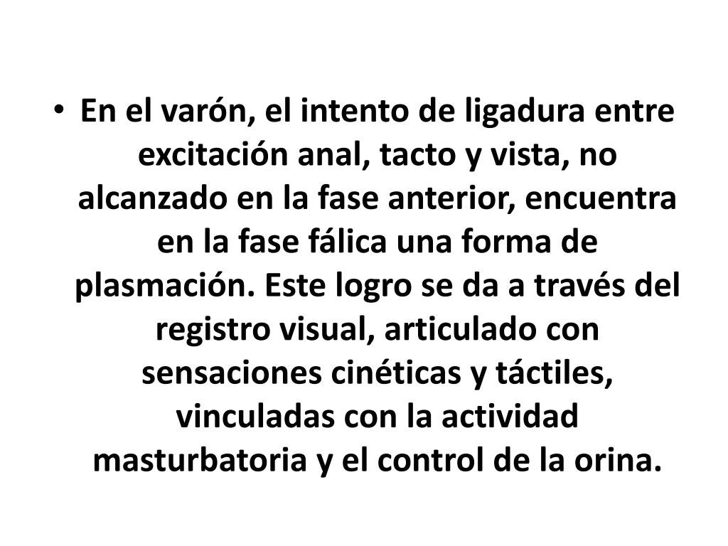 En el varón, el intento de ligadura entre excitación anal, tacto y vista, no alcanzado en la fase anterior, encuentra en la fase fálica una forma de plasmación. Este logro se da a través del registro visual, articulado con sensaciones cinéticas y táctiles, vinculadas con la actividad masturbatoria y el control de la orina.